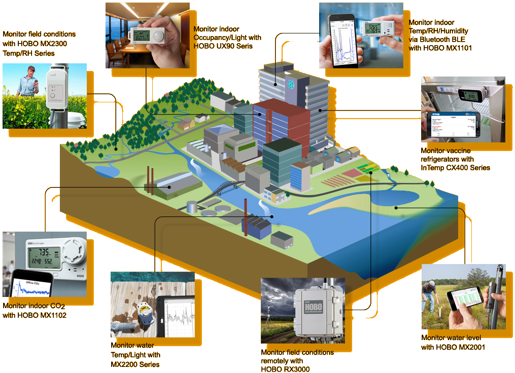 Depending on the particular data logger, measurements can include air temperature, relative humidity, AC/DC current and voltage, differential pressure, time-of-use (lights, motors, etc.), light intensity, water temperature, water level, dissolved oxygen, soil moisture, rainfall, wind speed and direction, leaf wetness, pulse signals, room occupancy, plug load, and many more.